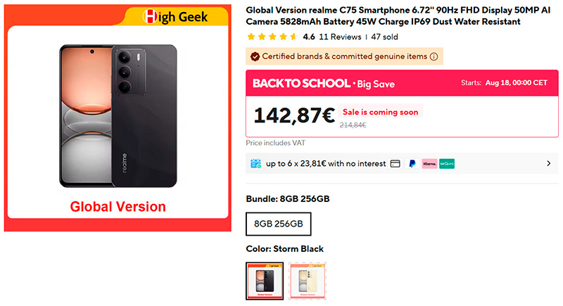 Дешевый смартфон Realme C75. Что вы получаете за эти деньги: платформа Mediatek Helio G92 Max, 6,72" IPS дисплей 90 Гц с защитным стеклом, влагозащищенность, памяти 8/256 ГБ, камеру 50 Мпикс, аккумулятор 6000 мАч с мощностью зарядки 45 Вт. По-моему, очень неплохо за 143 евро. И это Realme, вполне достойный производитель.