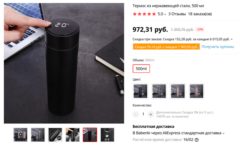 Наконец-то! Термос из нержавеющей стали с дисплеем на крышке, который показывает температуру напитка! На 500 мл, четырех цветов. Заказал бежевый. Он соответствует моему образу вдумчивого и ответственного пользователя!