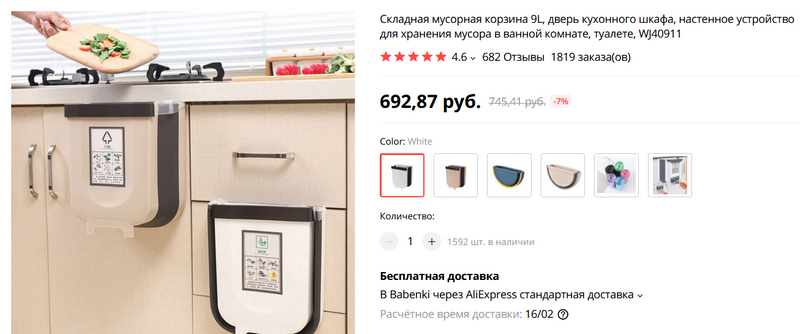 Складная мусорная корзина. Монтируется куда угодно на два небольших пластмассовых крючка с липкой лентой. После использования (например, очистки в них побросали в процессе готовки, а потом пакет переложили в основной мусорный мешок) складывается и места не занимает. Разных расцветок, разных форм и конфигураций. Вдумчивый пользователь всегда найдет, куда установить складную мусорную корзину, и сумеет произвести достаточное количество мусора, чтобы эффективно использовать рабочую емкость устройства.