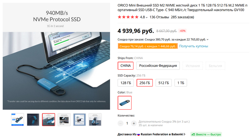 Очень маленькие (размером с флешку) и очень быстрые SSD M.2 NVME различных размеров от Orico. Есть доставка с российского склада, но там остались последние экземпляры. Отличная замена устаревшим крупным и медленным внешним жестким дискам. Вдумчивый пользователь всегда найдет, чем быстро заполнить компактный внешний SSD и как потом быстро эту информацию перекачать на другие эффектные носители.