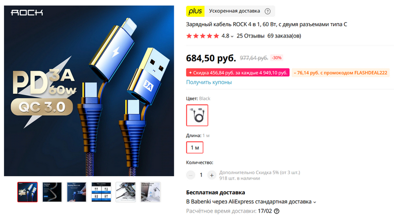 Универсальный метровый кабель Rock Type-C - Type-C с поддержкой быстрой зарядки до 60 ватт (подходит для ноутбуков), при этом он еще имеет и дополнительные насадки, превращающие его в кабель USB-A (3A) - Type-C и Lightning - Type-C. Удобная штука! Вдумчивый пользователь сможет реализовать с помощью данного кабеля все свои тайные мечты по многофункциональному использованию.
