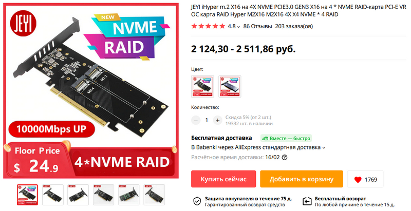 Кстати, по поводу быстрых SSD M.2 NVME. Обычно на материнских платах ПК ограниченное количество слотов под SSD M.2 (один или два слота). И если вам вдруг хочется поставить в компьютер дополнительные SSD и, может быть, еще и организовать из них RAID-массив, то в этом поможет вот такое устройство JEYI iHyper m.2 X16: плата вставляется в PCI 3.0, в нее можно поставить до четырех SSD M.2 и также можно организовать из них RAID-массив. Вдумчивый и тонко чувствующий пользователь сможет организовать с помощью этой платы очень продвинутый RAID, который всегда будет открыт новым свершениям.