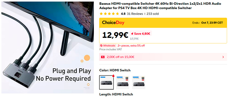 Компактный HDMI-переключатель Baseus на три порта. Поддерживает разрешение 4K и два направления - 1 в 2 или 2 в 1. Не требует питания.