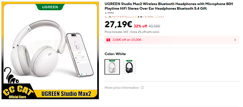 Недорогие беспроводные полноформатные наушники Ugreen Studio Max2. Bluetooth 5.4, задержка 0,06с, кодеки SBC и AAC, до 80 часов прослушивания на одном заряде. 5 минут зарядки дают 5 часов прослушивания. Управление - кнопочное. Есть режим шумоподавления при разговоре. Поддерживается мультипоинт и настройки через приложение. Белого и черного цветов.