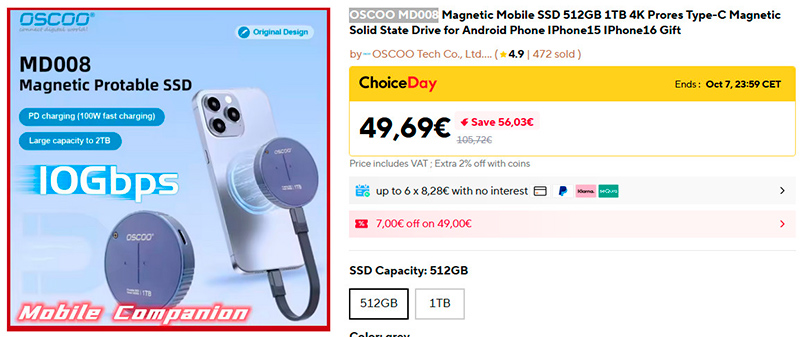 Интересная какая штука - это магнитный накопитель OSCOO MD008 на 512ГБ или 1ТБ. Он снабжен удобным кабелем для подключения к порту Type-C. Также у него есть второй порт, при подключении к которому адаптера он одновременно работает как зарядка с мощностью до 100 Вт. Подходит для айфонов и андроидных смартфонов с OTG. Также, конечно, может использоваться как внешний SSD для планшетов, ноутбуков и ПК.