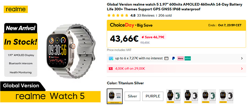 Компания Xiaomi совсем недавно представила новые умные часы Realme Watch 5, и вот на Aliexpress появилась глобальная версия, причем за цену обычного фитнес-браслета. А это вполне полноценные умные часы: двухдюймовый дисплей на матрице AMOLED, яркость 600 нит, аккумулятор 460 мАч (обещают до 14 дней автономности), есть микрофон и динамик, есть GPS и влагозащита IP68.