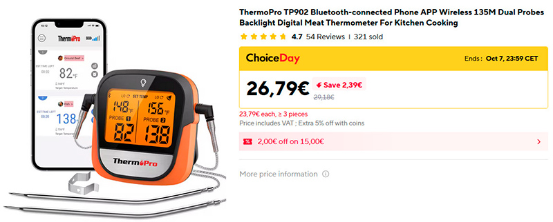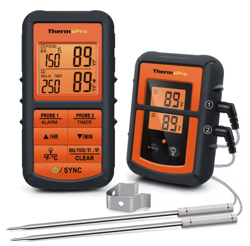 Термометр для мяса с двумя проводными щупами и поддержкой работы через приложение. Я использую почти такой же (немного другая модель этого же производителя) - он классный. Всякие беспроводные - постоянно глючат. А этот - и надежный, и удобный. Для уличного гриля, для духовки, для сковородки - для всего годится. А два щупа нужны, когда готовится, например, большой кусок мяса или целая птица.
