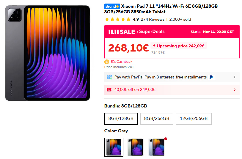 Мощный 11-дюймовый планшет Xiaomi Pad 7 (мой обзор) в стартовой комплектации на распродаже обещают за 242 евро. На Amazon эта комплектация стоит на 50 евро дороже.