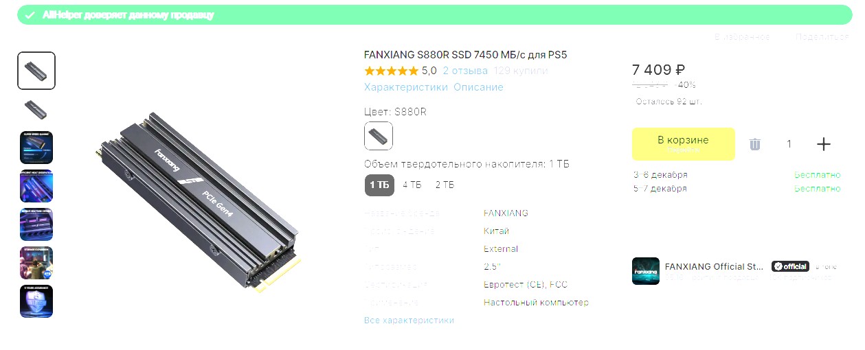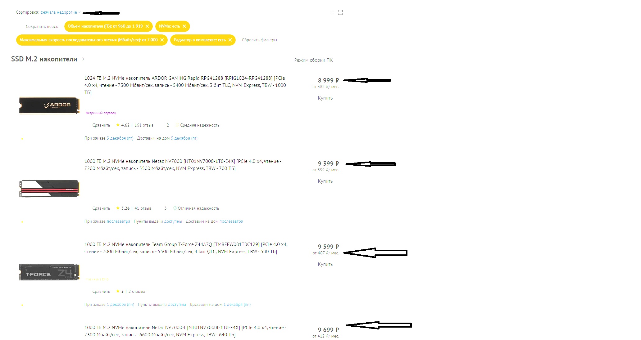 Штош, идём в один популярный магазин на три буквы и делаем сортировку от самых дешевых, PCIe4, с радиатором, 1Тб. Результаты на скриншоте.