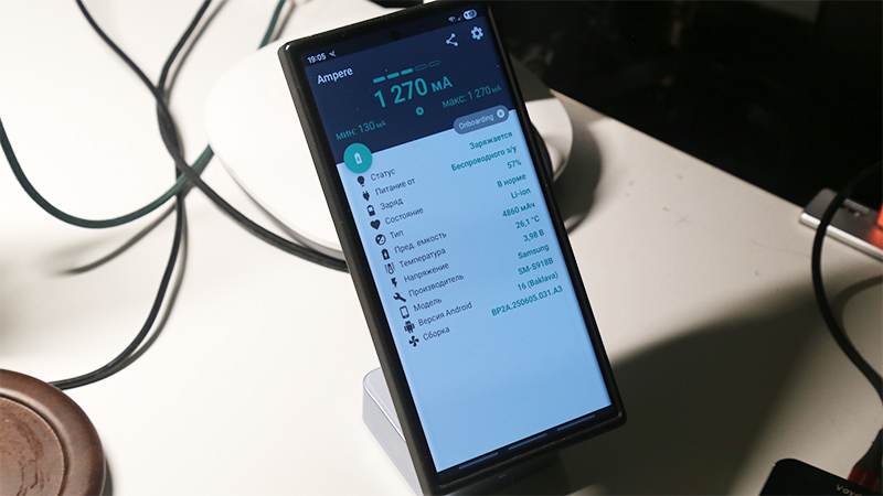 Мой смартфон на зарядке на данном адаптере. Смартфон заряжен наполовину, ток на контроллере смартфона 1270 мА, но, впрочем, мой смартфон Galaxy S23 Ultra поддерживает беспроводную зарядку только 15 Вт.