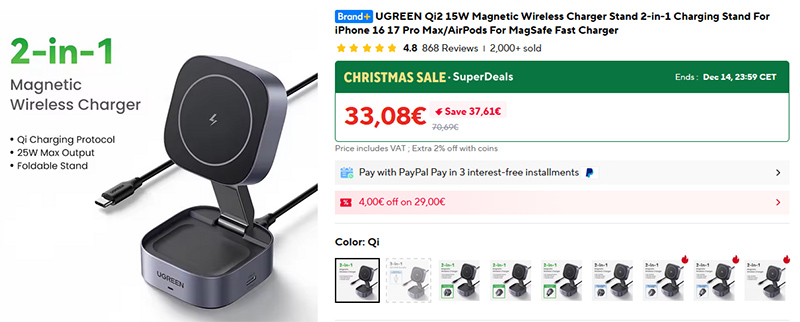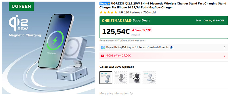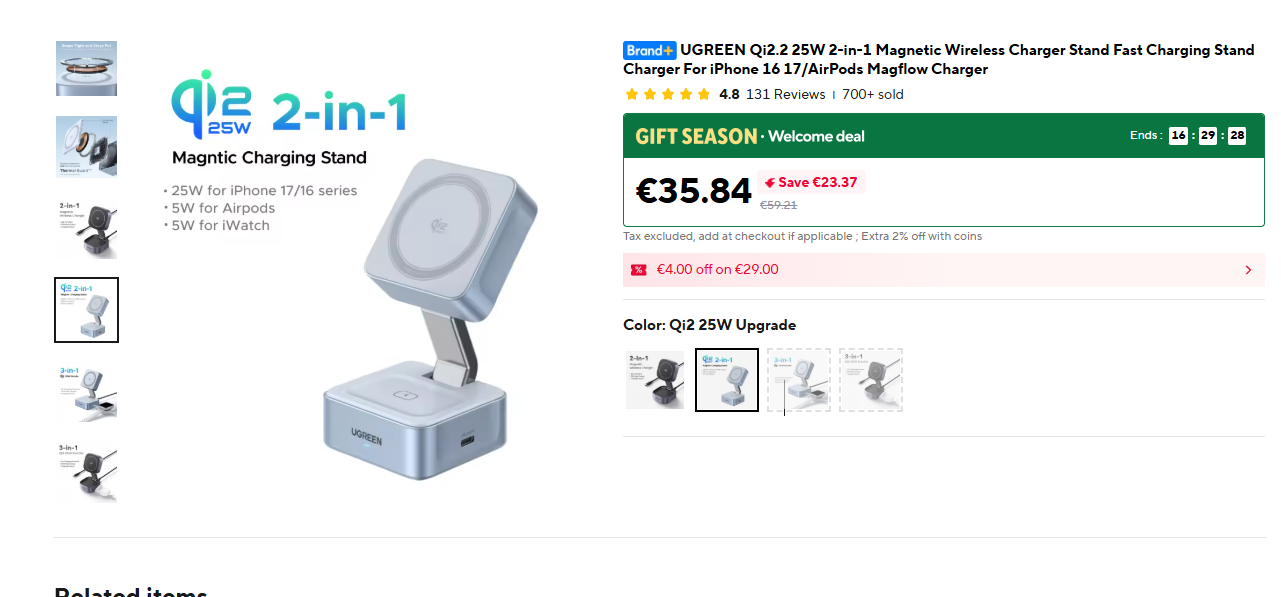Понятно, что если у вас смартфон поддерживает беспроводную зарядку в 15 Вт, то нет смысла тратиться на подобное устройство. Но у UGREEN есть аналогичный магнитный адаптер "2 в 1" с поддержкой Qi2 15Вт (суммарная выходная мощность там - 25 Вт), и он стоит всего 33 евро.