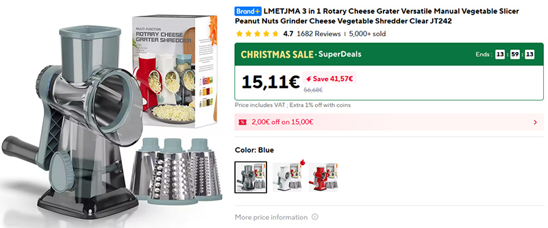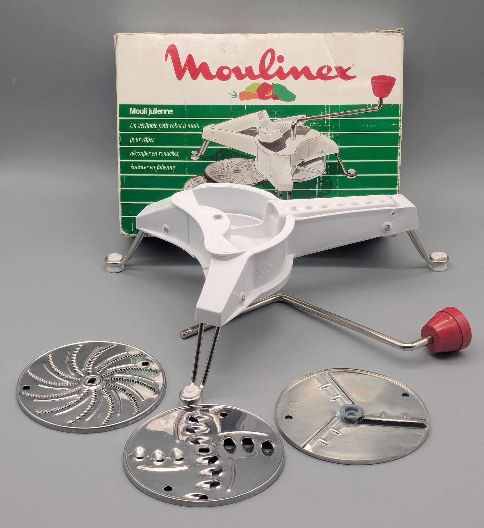 Продвинутая и очень удобная терка со сменными головками для овощей, сыров и так далее. С ее помощью можно очень быстро натереть самые разнообразные продукты в подставленную емкость, а мыть ее даже проще, чем обычную терку (она вся разбирается). Есть мощная присоска для надежного закрепления терки на поверхности. У меня много лет используется очень похожая модель, не нарадуюсь.