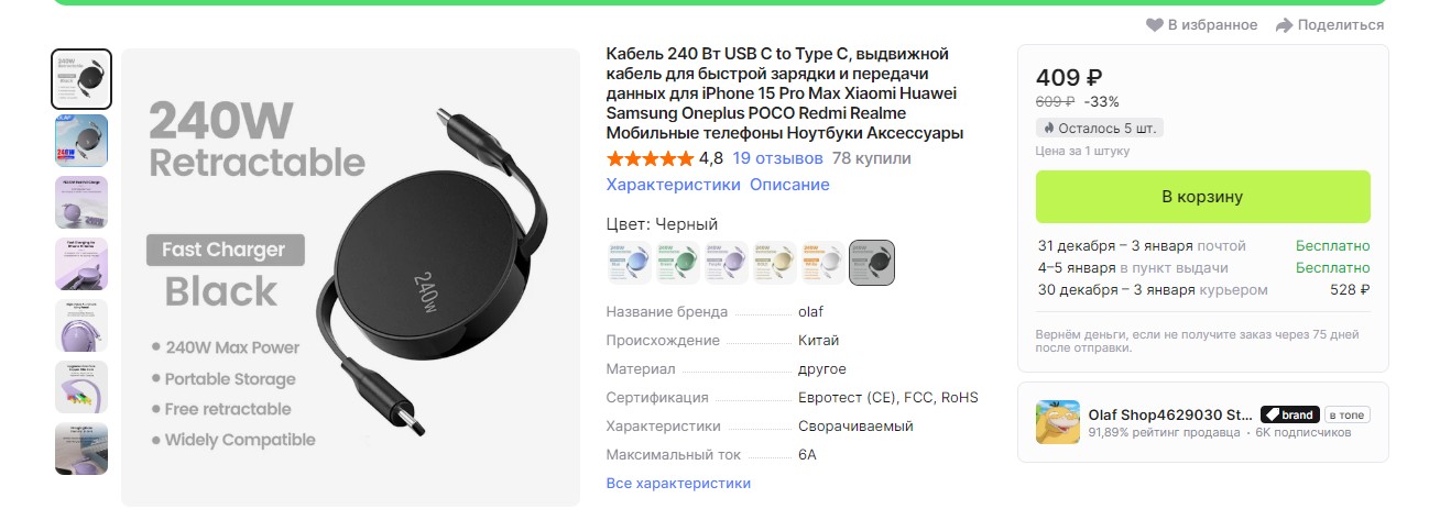 Длина кабеля 1 м, Type-C штекер, мощность 240 Вт, поддерживает быструю зарядку, передачу данных скоростью 480 Мбит/с.