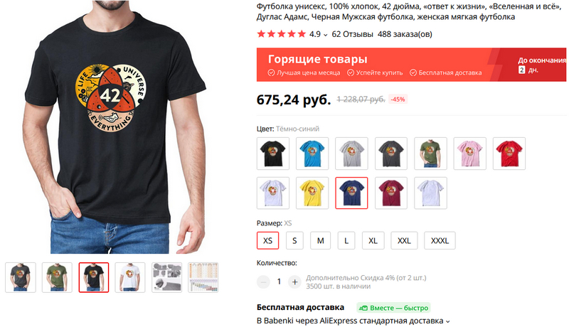 Вот в этой заметке народ увидел на мне майку, содержащую ответ на главный вопрос жизни, Вселенной и всего такого, и в письмах спрашивали, где купить. Я эти майки (штук пять разных) давно покупал на Aliexpress, с ходу не нашел, но мне тут недавно Facebook подсунул рекламу заметно более качественно выполненных маек с тем же ответом, которые в рекламируемом магазине продавались по €26 (2300 рублей), ну и я их, разумеется, нашел на Aliexpress, где они стоят в районе шестисот рублей, причем там большой выбор цветов и размеров (размер лучше проверять по табличке, которая там приведена). 100%-ный хлопок (не всех цветов, часть - 50%-ный, они там предупреждают), отзывы хорошие. Я себе пять штук заказал разных цветов - пора уже старые майки заменить.
