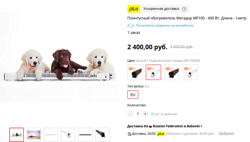 Как раз для зимы - плинтусный обогреватель на 400 ватт. Размер - метр, можно выбрать между двумя вариантами цветов, также можно выбрать, с какой стороны будет провод.