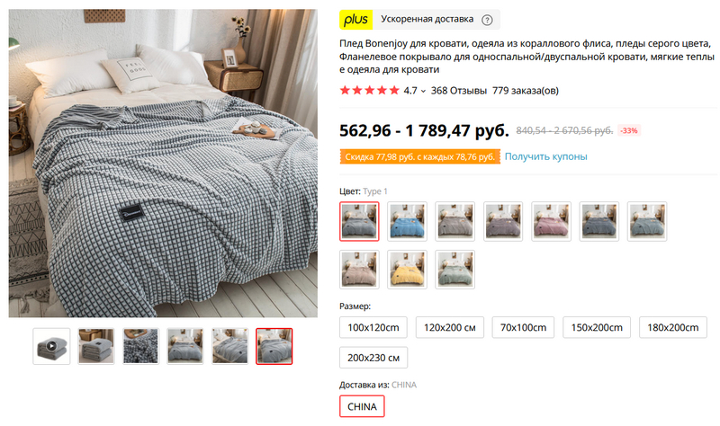 Мягкий, очень приятный на ощупь (как пишут в отзывах) плед-покрывало различных размеров и цветов.