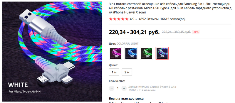 Удобный универсальный кабель для зарядки с тремя головками: Type-C, microUSB и Lightning. При зарядке еще и красиво светится, причем цвет можно выбрать при покупке. И есть два размера.