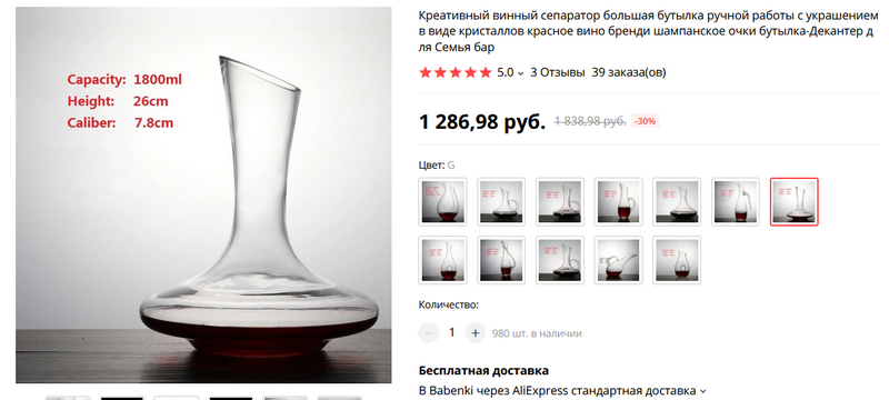 Кстати, там по ссылке - большой выбор декантеров самых разнообразных форм. Есть небольшие, для одной бутылки, есть красивые и вычурные - хороший подарок для человека, любящего красное вино: например, такой, как на фото ниже (он тоже есть там же по ссылке).