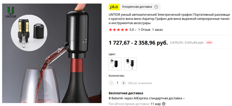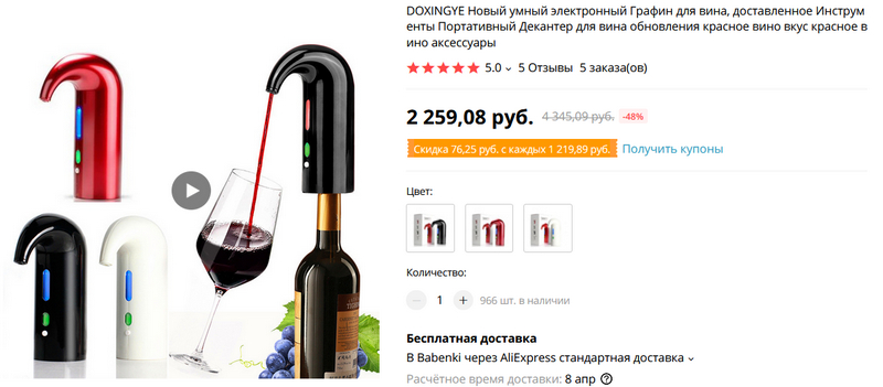 Ну и есть еще вот такой вычурный аэратор, заряжающийся от microUSB: я его использую, когда приходят гости. Гости от этой бандуры - просто в восторге. Ну и аэрирует действительно хорошо.