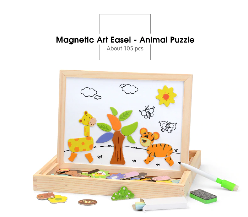 Размером чуть больше А4, в комплекте доска с одной стороны магнитная, с другой для рисования мелками, губка, фломастеры, куча магнитов и мануал для составления картинок для детей. Хорошо для общего развития ребенка и места много не занимает, можно брать в качестве дорожного развлечения. Доставка нормальная, продавец адекватный.