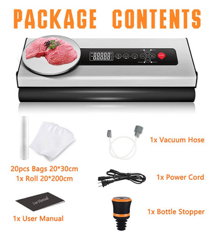 В комплект входят: вакууматор с весами, набор пакетов, трубка для откачивания воздуха из вакуумных контейнеров, вакуумная пробка для бутылок, кабель питания, руководство пользователя.