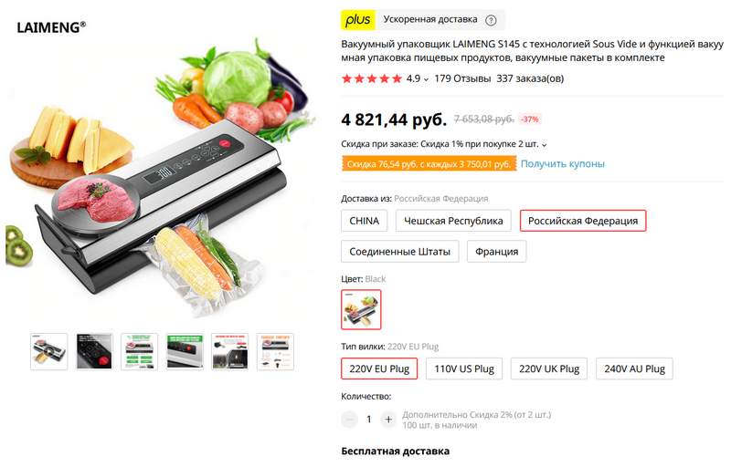 Я не сразу нашел вакууматор, который бы отвечал всем моим потребностям, но в итоге все-таки остановился вот на таком - это Laimeng 6621 (мой обзор этого устройства), который до сих пор можно купить на Ali с доставкой с российского склада, однако цена на него с момента моего обзора поднялась почти в два раза - сейчас он стоит примерно 3500 рублей, но и за эти деньги, на мой взгляд, это отличное устройство: я его использую постоянно и ни разу в нем не разочаровался.