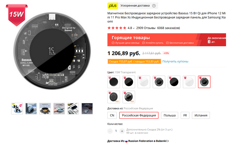 Если у вас смартфон поддерживает быструю зарядку в 10-15 ватт, то рекомендую приобрести для него вот такой беспроводной зарядный адаптер от Baseus. Там есть и на 10 ватт (дешевле), и на 15 ватт.