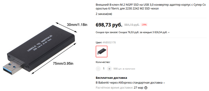 После этого покупаете SSD M.2 нужного размера (до 75 мм в длину), нужной емкости и соответствующих скоростных характеристик от предпочитаемого производителя, ставите этот SSD в переходник и - вуаля!