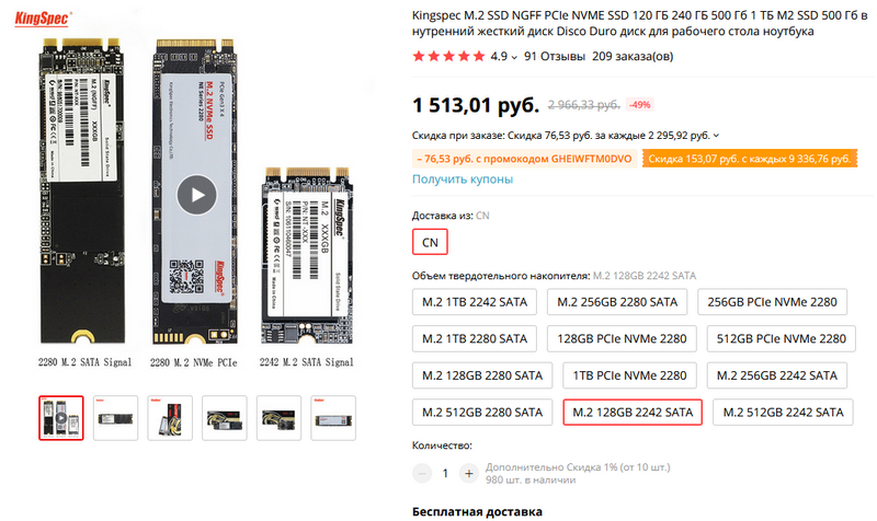 Если хочется сэкономить, то вот неплохие и недорогие SSD от KingSpec - разные размеры (80 мм - не годятся, не влезут), разные емкости и разные скорости (NVMe - более быстрые).