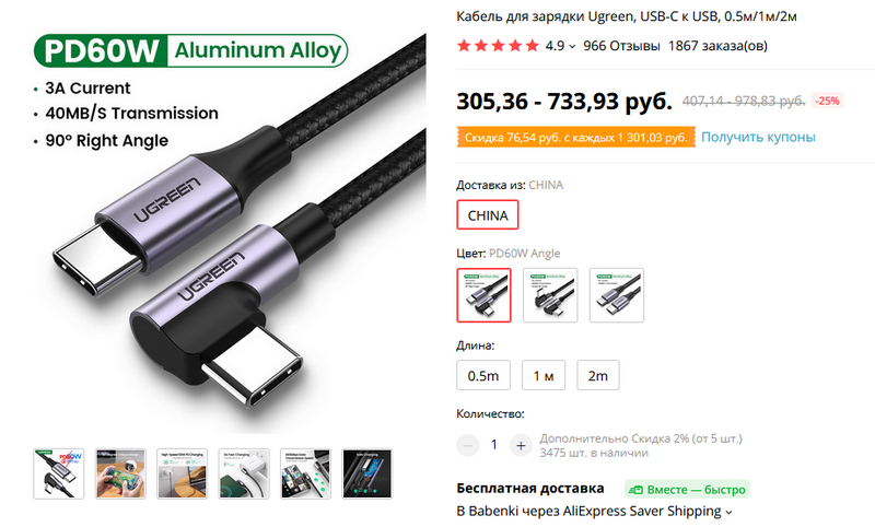 Качественные кабели Type-C от Ugreen. С поддержкой мощности зарядки до 60 ватт, трех размеров - полметра, метр, два метра, ну и самая интересная фишка - можно взять кабель с одной повернутой на 90 градусов головкой, а можно с двумя. А можно с обычными прямыми головками. Я пару с одной повернутой головкой заказал, есть области применения.
