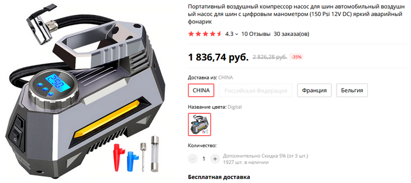 Мощный, но при этом компактный автомобильный компрессор. Что ценно - с цифровым дисплеем, а не стрелочным.