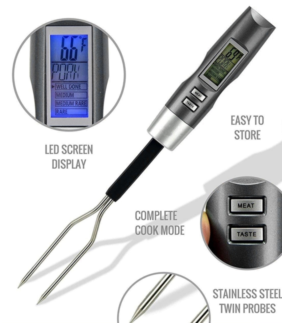 А потом в процессе готовки в мясо удобно такой вилкой с термометром потыкать, что понять приготовилось или нет. Показывает не только температуру, но и степень готовности в зависимости от вида мяса (говядина, телятина, баранина, свинина, индейка, курица).