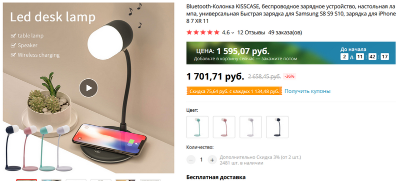 Интересное устройство "3 в 1" - это и настольный светильник, и беспроводная зарядка, и беспроводная колонка.