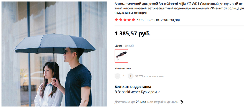 Зонт Xiaomi Mijia. Складной, портативный, с водоотталкивающим покрытием, с защитой от ветра. Ширина 102 см, подходит для двоих человек. И, как уверяют на странице продавца, вес 415 г, что эквивалентно рисовому банту, и дети не будут чувствовать себя тяжелыми. Вы же не хотите, чтобы дети чувствовали себя тяжелыми, правильно?