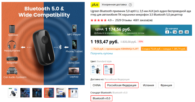 У, UGREEN, к слову есть специальный bt-трансмиттер, с питанием от USB и AUX-выходом. Данная конфигурация намного удобнее для авто, т.к. не нужно думать о зарядке. Сам приобрел такую. Выводить музыку из телефона - нормально, но звонить через нее плохо: слабый микрофон.