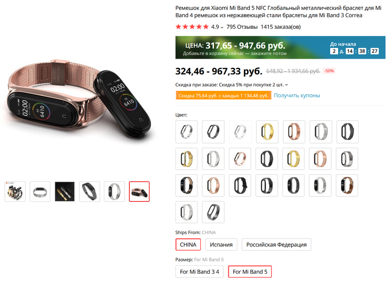 Для пользователей фитнес-браслета Xiaomi Mi Band 5 (а также Band 4 и Band 3) - большой выбор недорогих металлических браслетов различных цветов