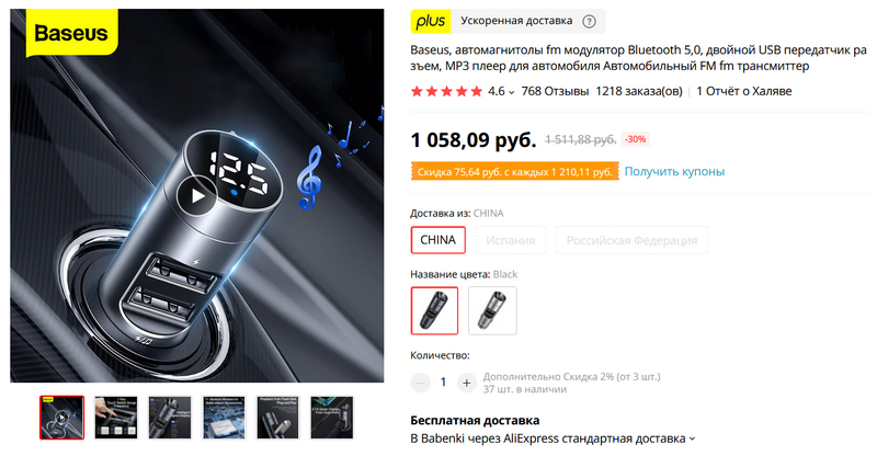 Ну и вот еще интересное устройство от Baseus для автомобиля: во-первых, это зарядный адаптер для прикуривателя на два порта с поддержкой QC 2.0, во-вторых, он с дисплеем, который показывает напряжение в бортовой сети автомобиля, в-третьих, он может работать FM-передатчиком и умеет воспроизводить музыку с флешки.