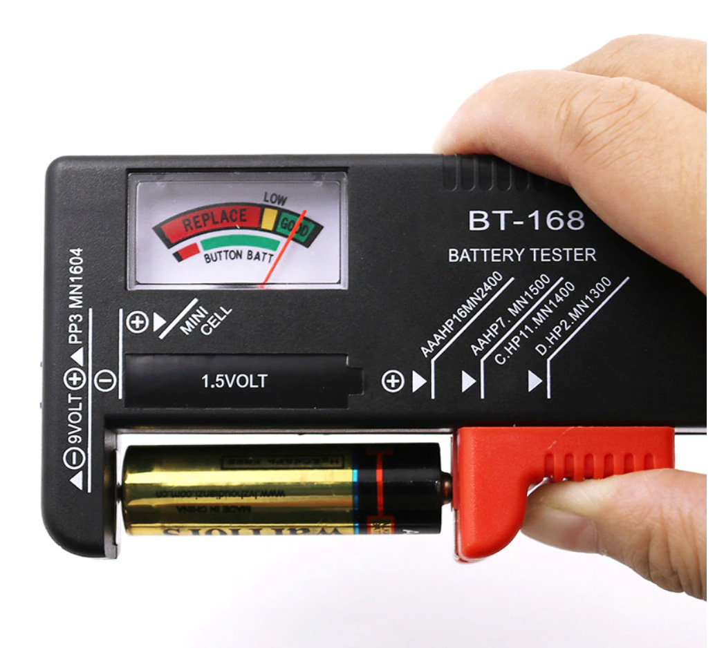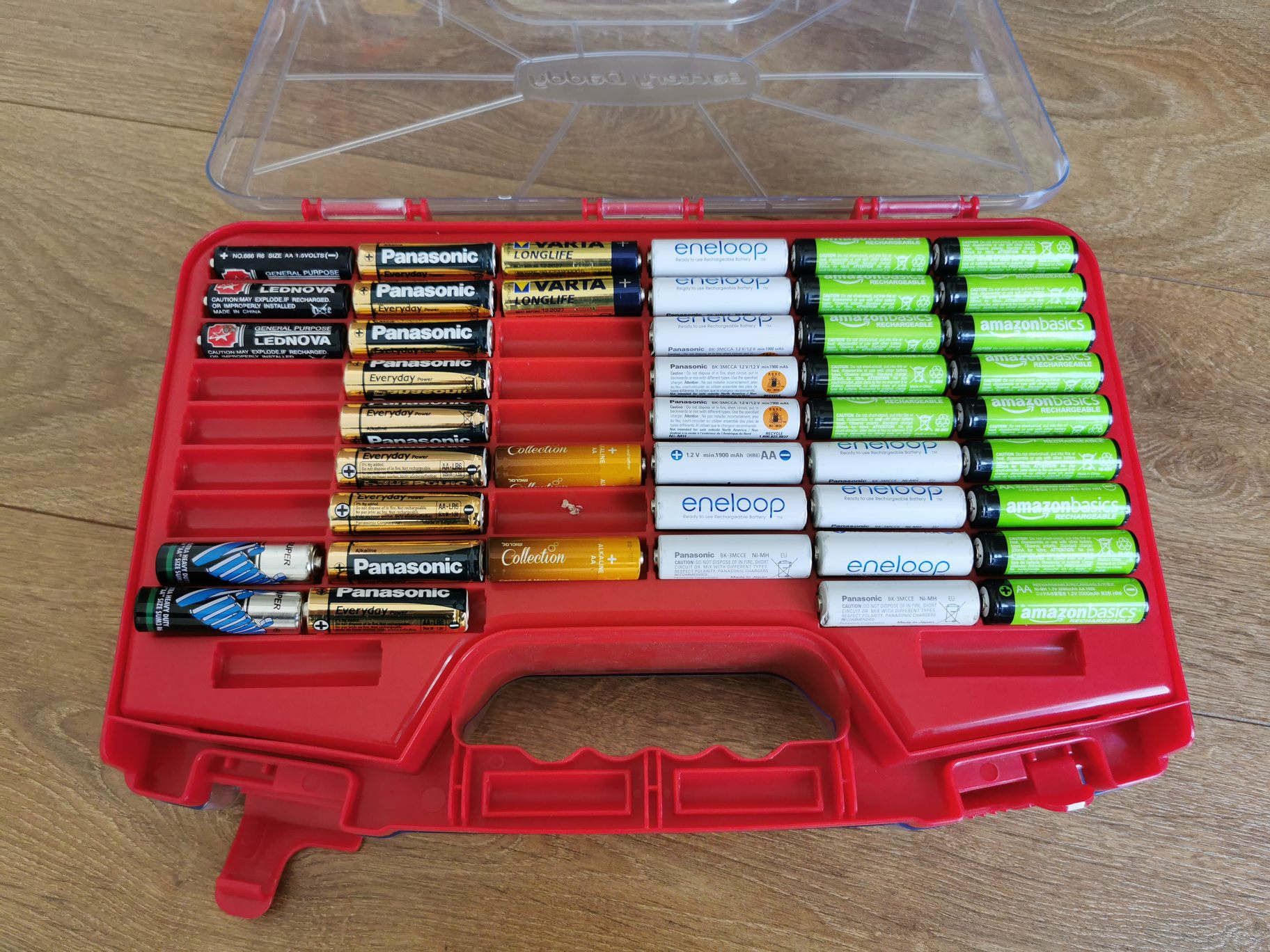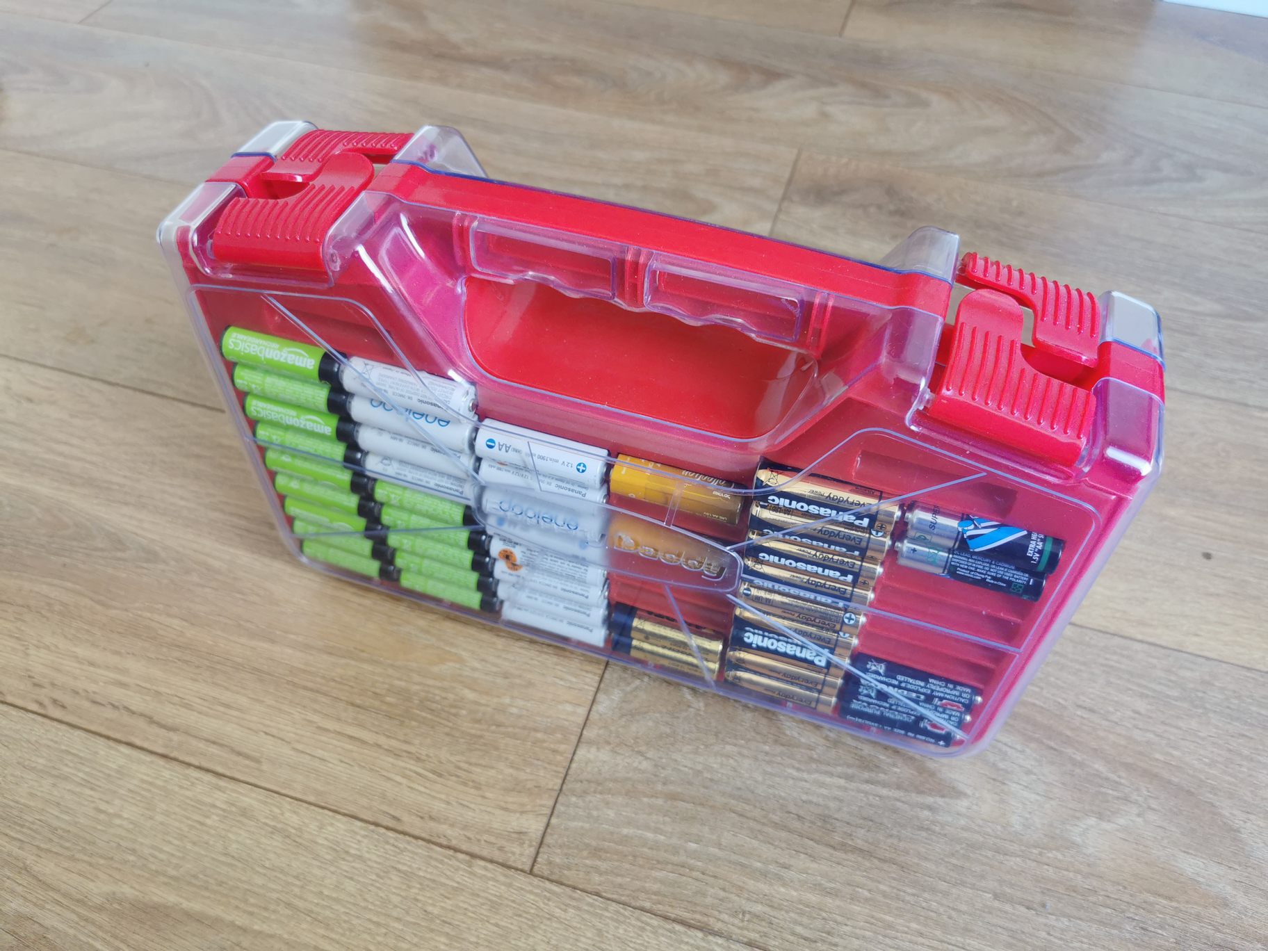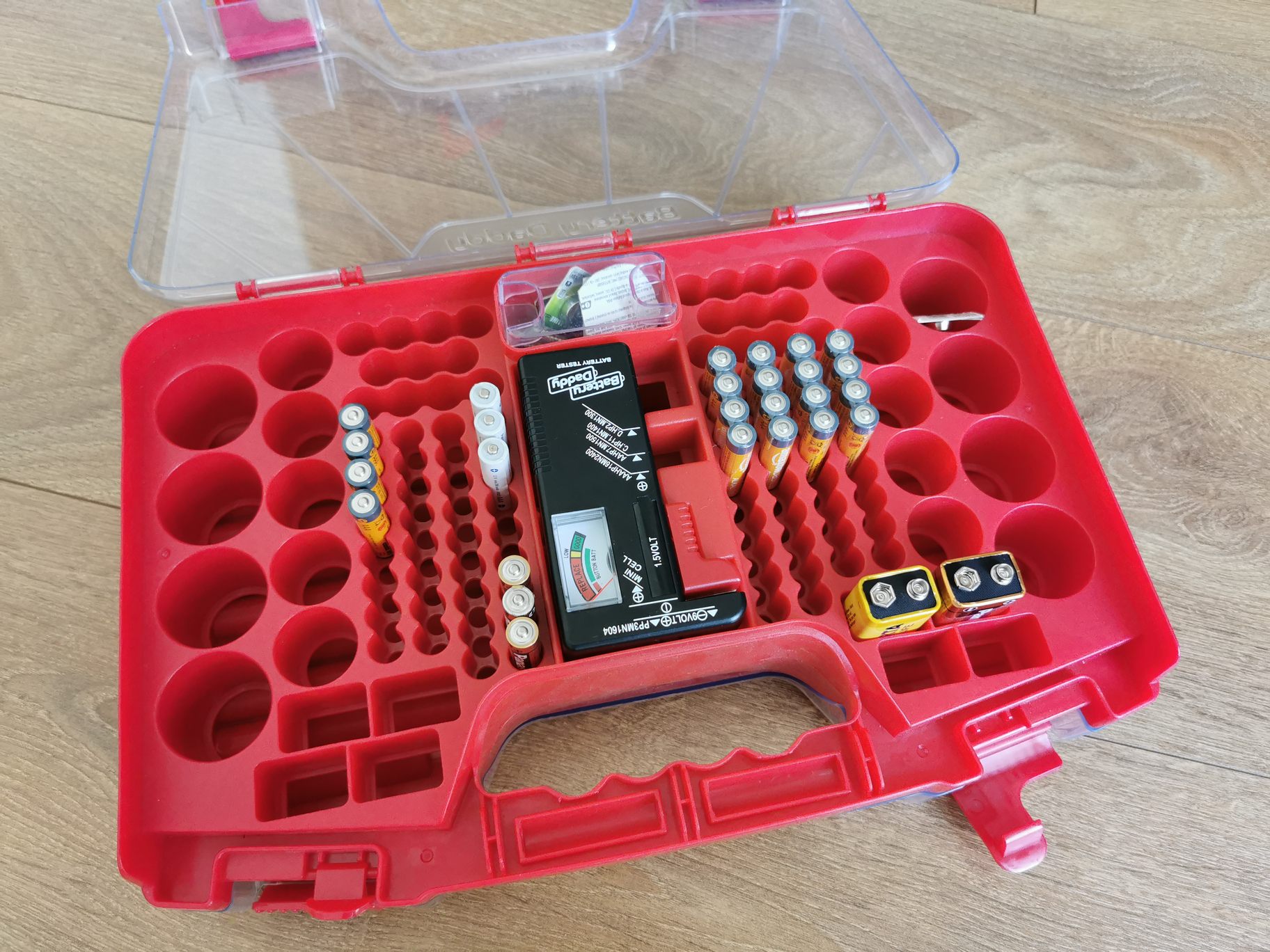 И только недавно я сообразил, что наверняка существуют специальные органайзеры для батареек, которые могут прекратить этот бардак. Порылся на Aliexpress, выбрал вот такой вариант - мне он подходит на все сто. Плюс тут еще и тестер есть для батареек различного типа, чтобы проверять уровень заряда. У тестера всего три значения - "полностью заряжена", "наполовину разряжена", "разряжена", однако для бытового применения этого вполне хватит.