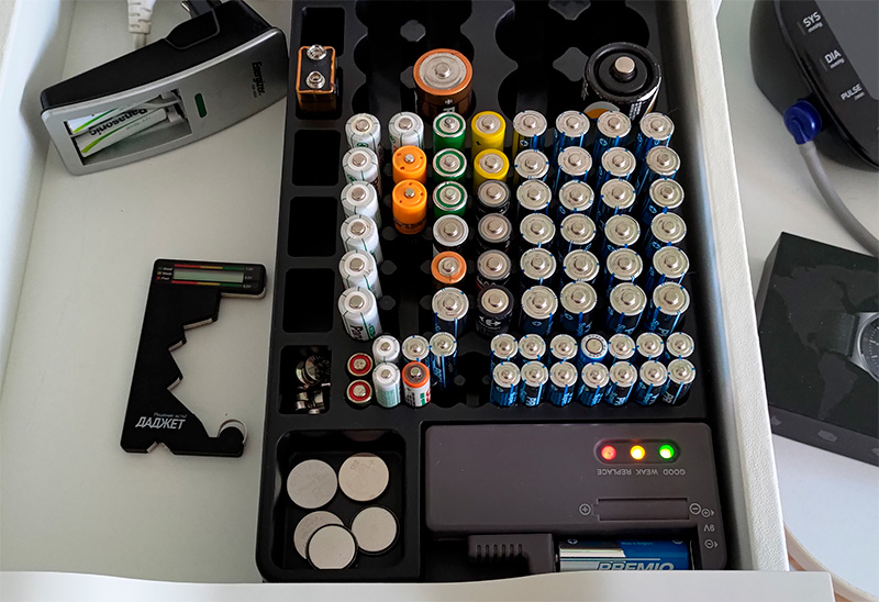 Доехал наконец-то органайзер для батареек, о котором я писал в одном из прошлом выпусков. Я его до этого уже заказывал, но в итоге так и не доставили. На этот раз все доехало благополучно, батарейки рассортированы и помещены в свои гнезда, теперь в ящике - полный порядок, вот прям рекомендую! Тестер для батареек, входящий в комплект, тоже работает вполне нормально, пользоваться можно. Мне, вообще-то, больше нравится тот тестер, который лежит рядом с органайзером, но если никакого тестера нет, то комплектным вполне можно обойтись.