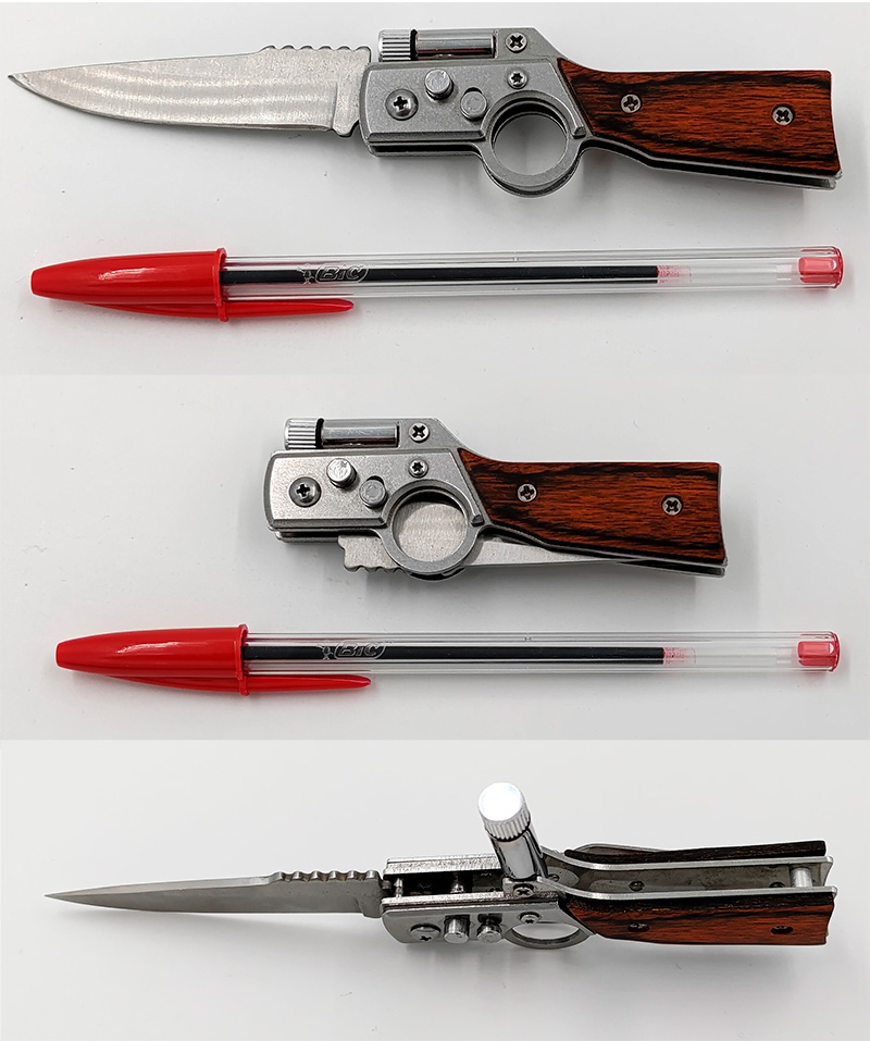 Ножик в форме ружья, о котором я писал, давно приехал. Очень прикольный, теперь любимая игрушка: лежит на столе, периодически используется для всяких мелочей вроде открывания упаковки и коробки. Он пружинный, лезвие выскакивает по нажатии кнопки (по фото на сайте этого не видно, но я заказывал именно там, куда ведет ссылка). Есть предохранитель, фиксирующий лезвие в закрытом и открытом положениях (он называется лайнерлок). "Прицел" является фонариком и откидывается на угол до 90 градусов. Включение и выключение фонарика - с помощью кольца с насечкой. Ручка покрыта настоящим деревом. С обратной стороны есть зажим - чтобы носить ножик на ремне.