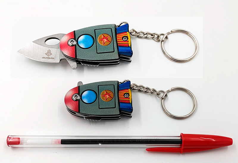 Открывается нажатием на рычажок, автоматически фиксируется. Чтобы закрыть лезвие, фиксатор нужно слегка отогнуть в сторону. Приехал хорошо заточенный, работает исправно. С ключами и другими брелоками не конфликтует. С брелками тоже не конфликтует, проверено.