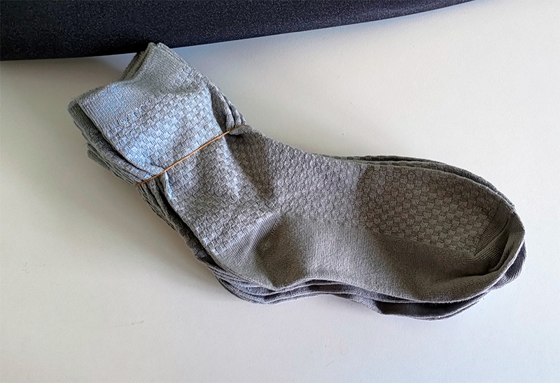 Комплект приходит упакованный в папиросную бумагу (кроме внешней упаковки), при этом на пары носки не разбиты, а просто стянуты резиночкой. Выглядит слегка нищебродски, но если ехать, а не шашечки, то нормально, тем более что сами носки - очень даже качественные: легкие, дышащие, мягкие и комфортные.