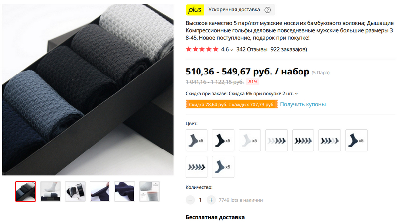 В комментариях рекомендовали вот эти носки из бамбукового волокна. Растягивающиеся, подходят для размеров 38-45 (на мой 42 отлично подошли), пяти цветов, поставляются по 5 пар как одного цвета, так и разных.