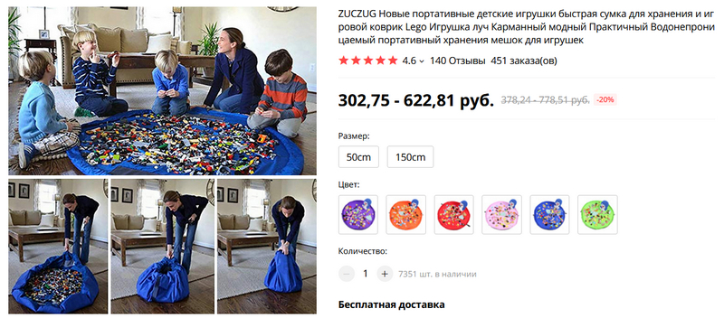 Эту штуку наверняка оценят родители малолетних детей и детей-подростков, играющих во всякие мелкие игрушки типа машинок и вечной родительской боли - конструкторов "Лего" и аналогичных. Потому что это - коврик-мешок. Двух размеров - полуметровый для маленьких детей и полутораметровый для детей постарше. Разных цветов - под разный дизайн детской комнаты. Работает предельно просто. Расстелили, ребенок сам (или с другими детишками) на этом коврике играет, а когда приходит пора убирать игрушки, коврик превращается в затягивающийся мешок и игрушки почти мгновенно убраны! Гениальная штука, заказываю самый большой!