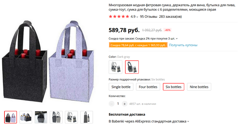 Приближаются весенне-летние шашлыки, пикники, барбекю и посиделки, так что рекомендую заранее заказать крайне полезную штуку - специальную фетровую сумочку для бутылок с вином. Двух расцветок и есть разные варианты: от одной до девяти бутылок. Я рекомендую сразу брать на 6-9 бутылок (и два экземпляра), не промахнетесь!