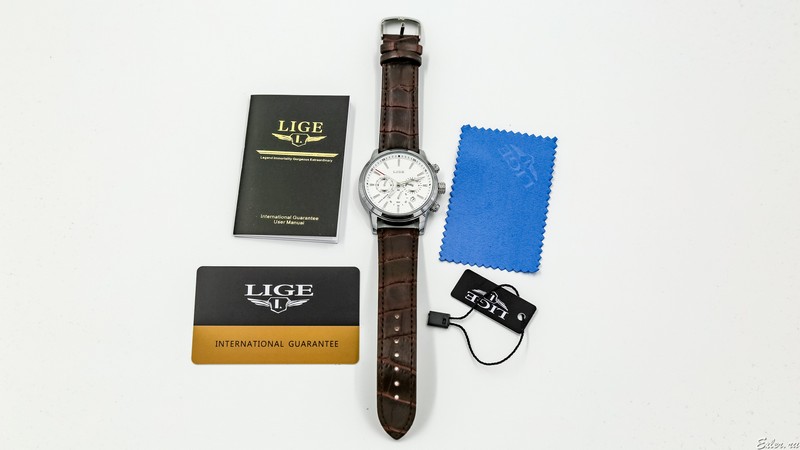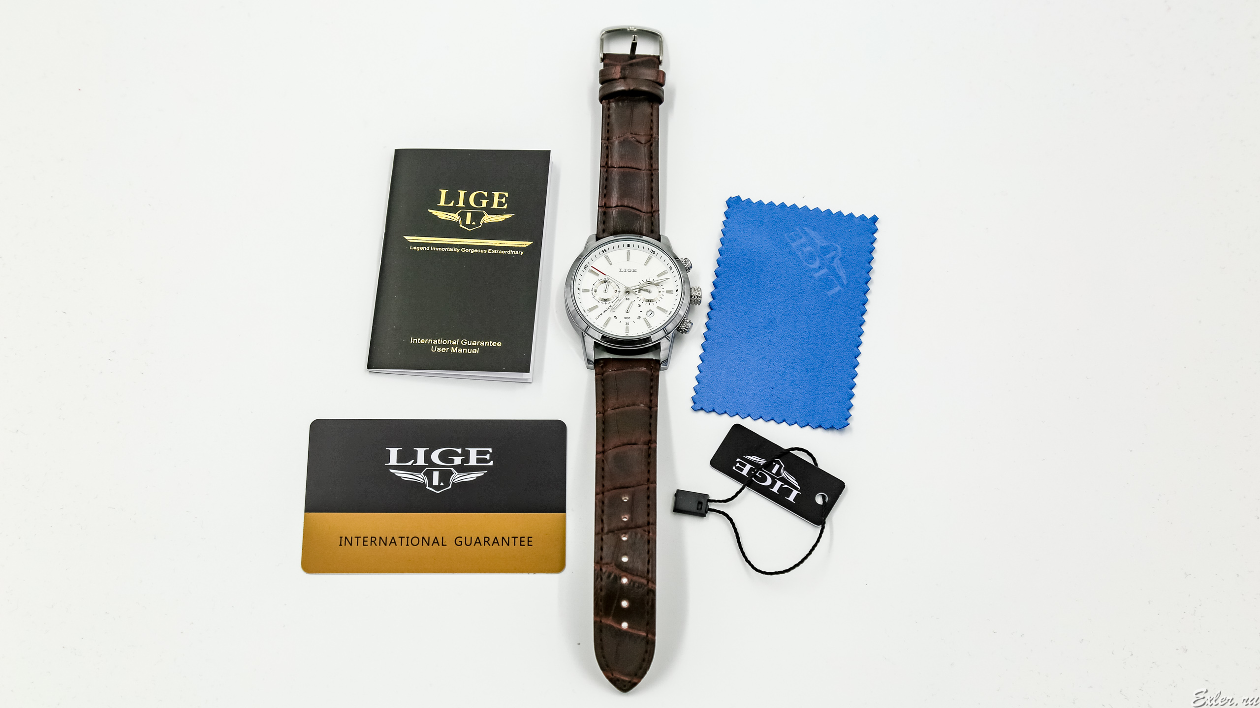 Комплект поставки: часы с ремешком, тряпочка для протирки циферблата, международная гарантия, пластиковая бирочка Lige с петелькой (я думаю, что ее можно носить на ключах - в знак принадлежности к касте владельцев часов Lige), инструкция на английском, все солидно!
