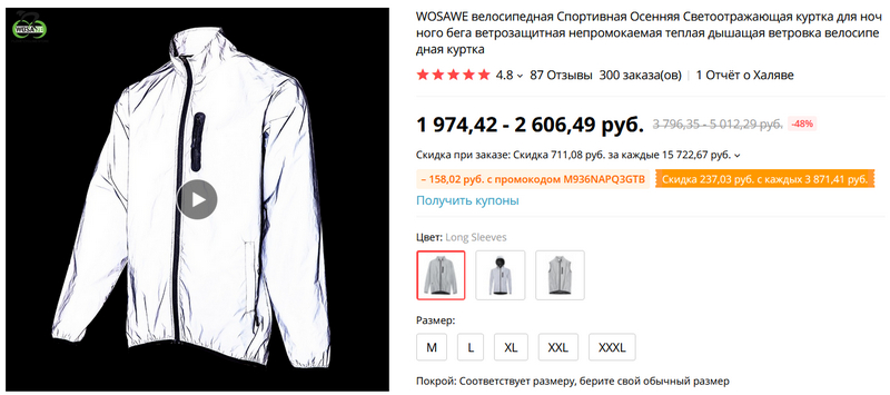 Вот это рекомендовали - три вида светоотражающих, ветро- и влагозащитных легких "дышащих" курток: подходят для бега, ходьбы, езды на велосипеде и мотоцикле, кемпинга, альпинизма и многих видов спорта на открытом воздухе. Там есть таблица с размерами.
