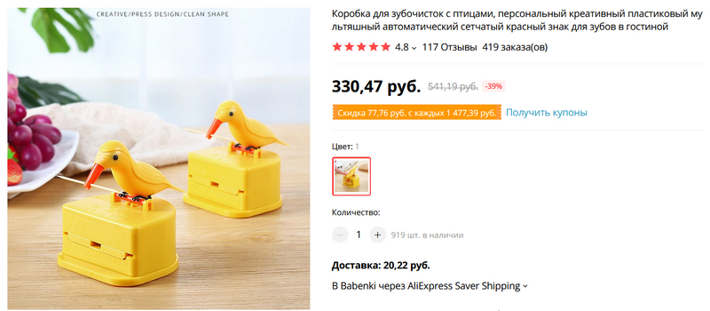 Люблю такое - коробка для зубочисток с птичкой-податчиком. Зубочистку у птички забрал, нужна новая - на голову ей нажимаешь, она тебе любезно достает еще одну зубочистку. Красота!