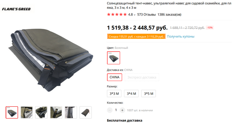 Как раз к приближающемуся летнему сезону - солнцезащитный тент-навес трех размеров: 3 × 3, 3 × 4 и 3 × 5 метров. В основном, конечно, предназначен для дач и загородных домов.