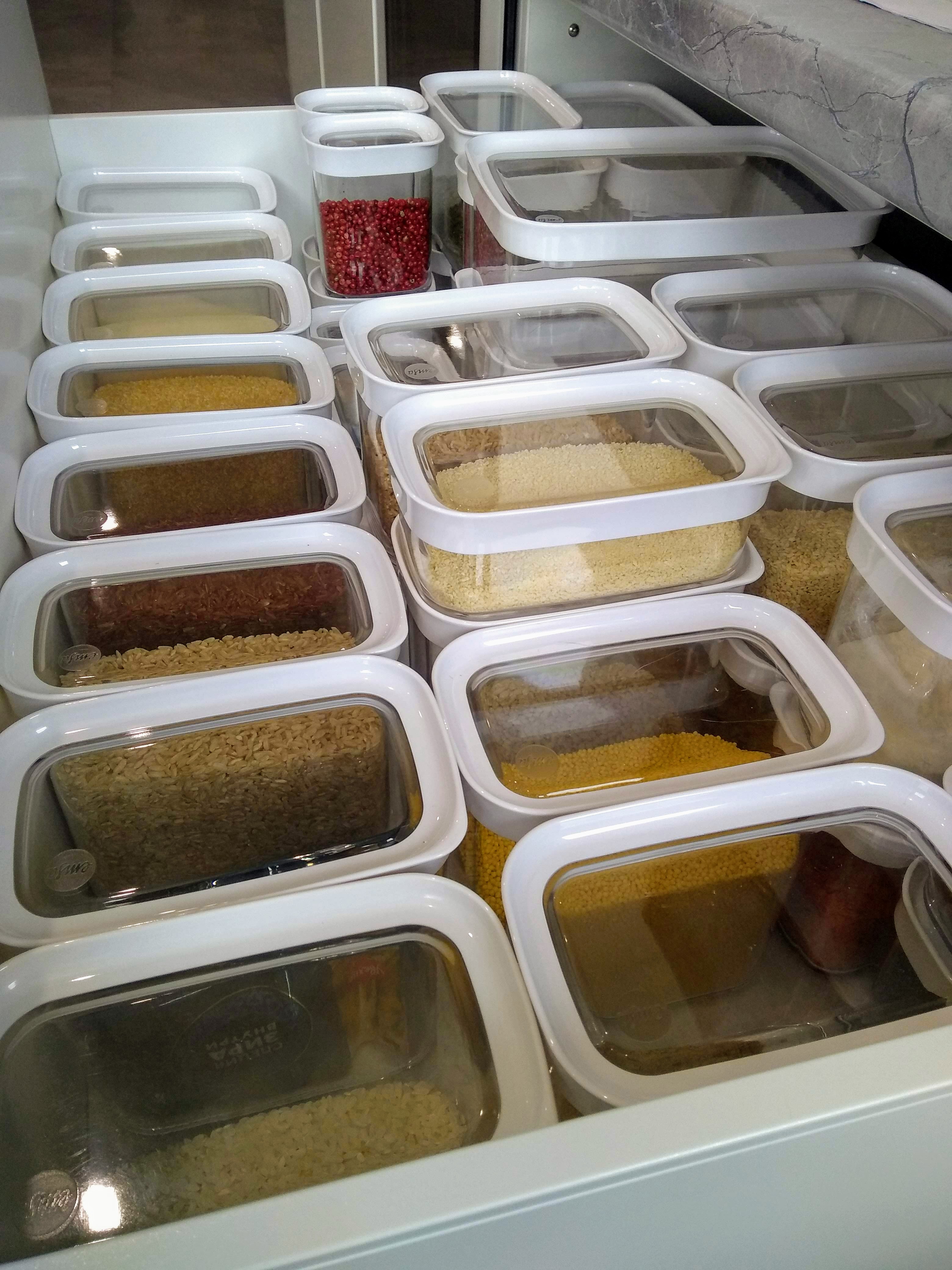 Мы долго выбирали и остановились на прямоугольных ёмкостях. Не пропадает место между ними и складировать удобнее. Прозрачные крышки позволили составить в ящик плотно, т.к. сверху все видно.